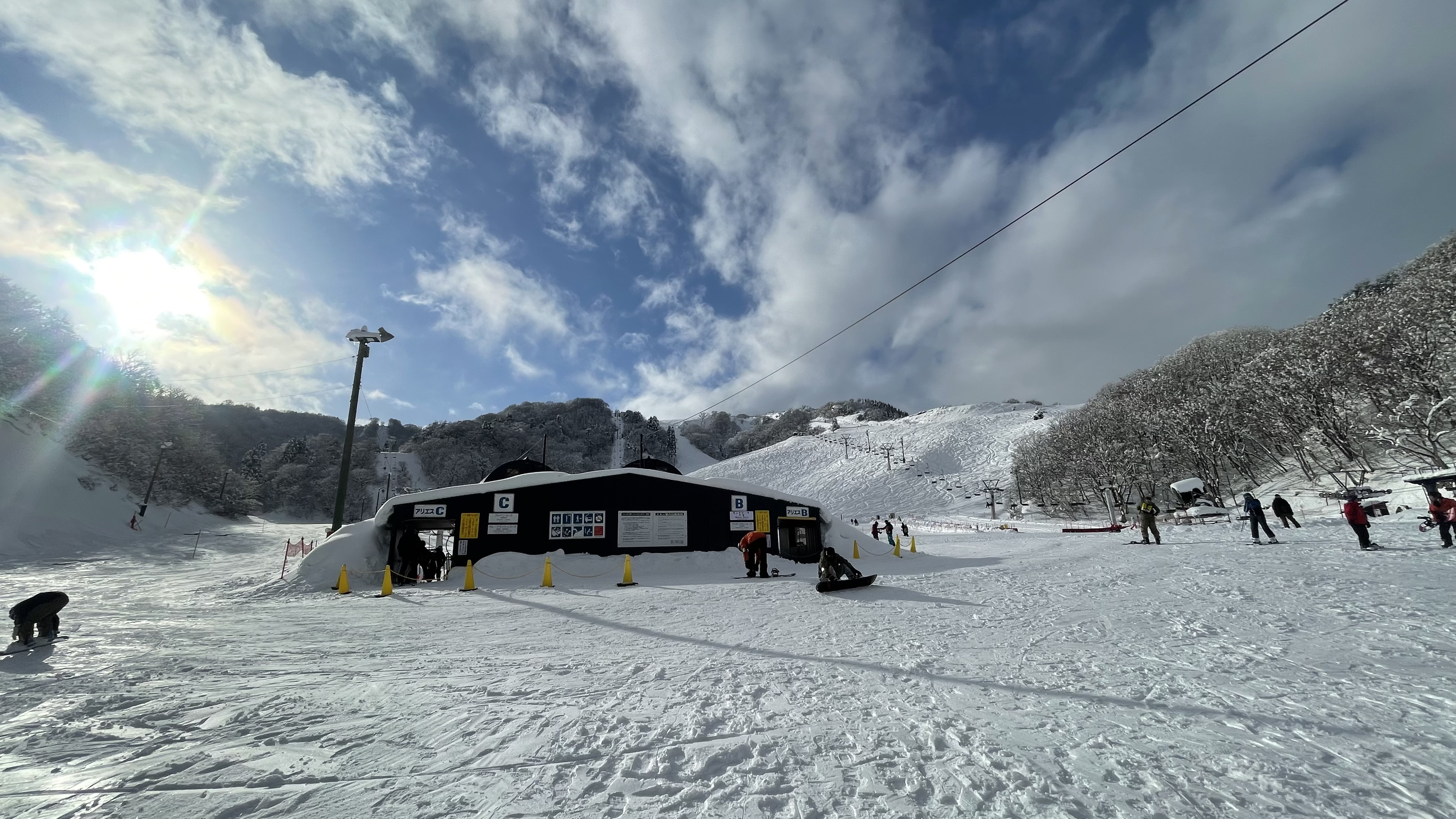 リフトまでの動線が上り坂ぎみ。アリエスCに乗る際、夫が子どものお尻を押してリフト乗車線まで誘導しました。アリエスBを降りてからも、圧雪ゾーンまでし...
