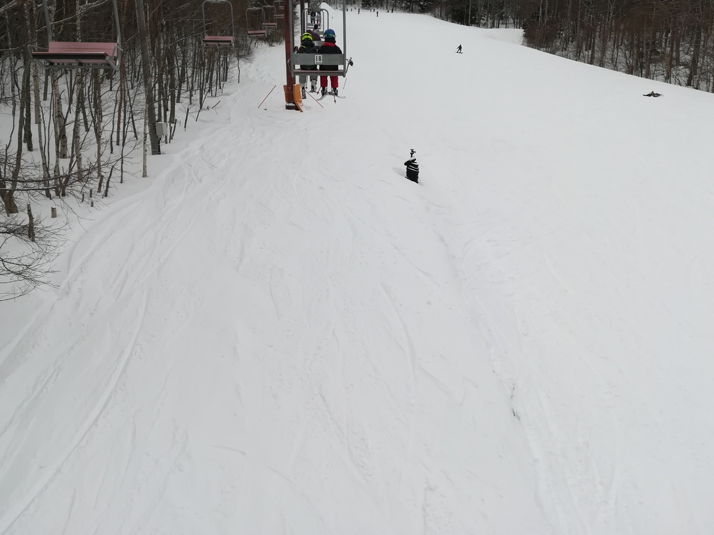 下から山頂を見上げ、左側~真ん中のファミリーコースは速いクアッドで朝一からガンガン回せる。クアッドに待ちができ始めたら、右側の人の少ないコースへ。疲れてくるとリフト上で休みたいので、すぐ山頂に着いてしまうよりゆっくり上る方が、良いセット間インターバルになることもある。それを考慮しても、ペアリフトはもう少し速くして欲しいと思う。クアッドが速いせいで凄く遅く感じる。