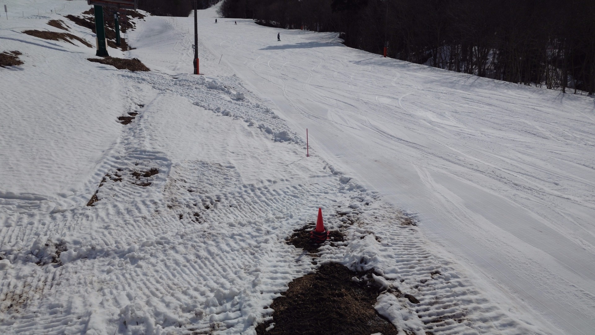 積雪40cm、雪もだいぶ少なくなり明後日まで営業できるかどうかギリギリな雰囲気、リフト係の人が明日の営業の為に雪を集めてストックしていました。