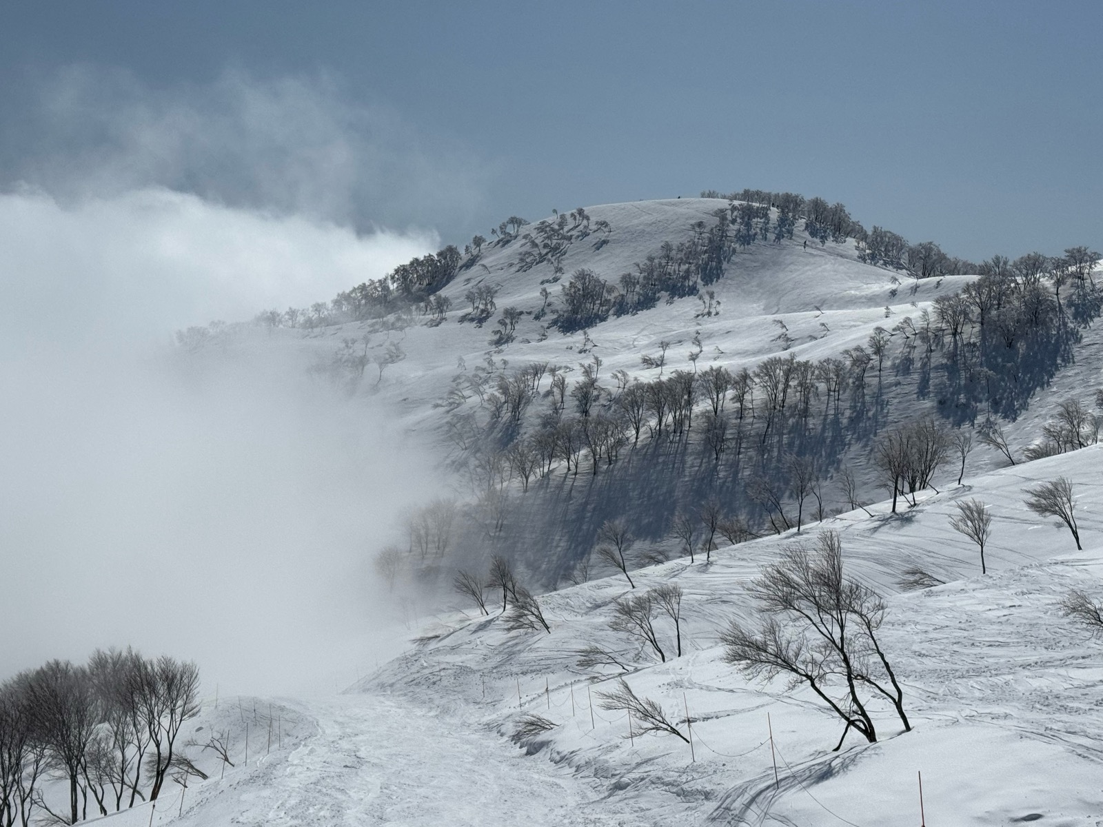 GRAY Ⅳ使用。8時45分膳棚。バーンは硬くはないがそれなりに良いが、ピステンが入ってない。夜中まで雨が降っていたのでしょうがない。バックサイドで後ろ足の母指球に乗る意識をして流しトレーニング。あちこちクラフト状態でかなり滑りにくく、トレーニングにならなかった。