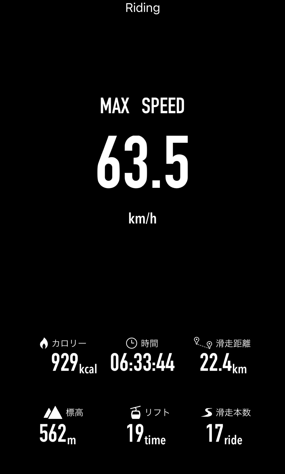 | 回 | 最高速度 | 平均速度 | 滑走時間 | 滑走距離 | 標高差 | 開始時刻 | 終了時刻 | |